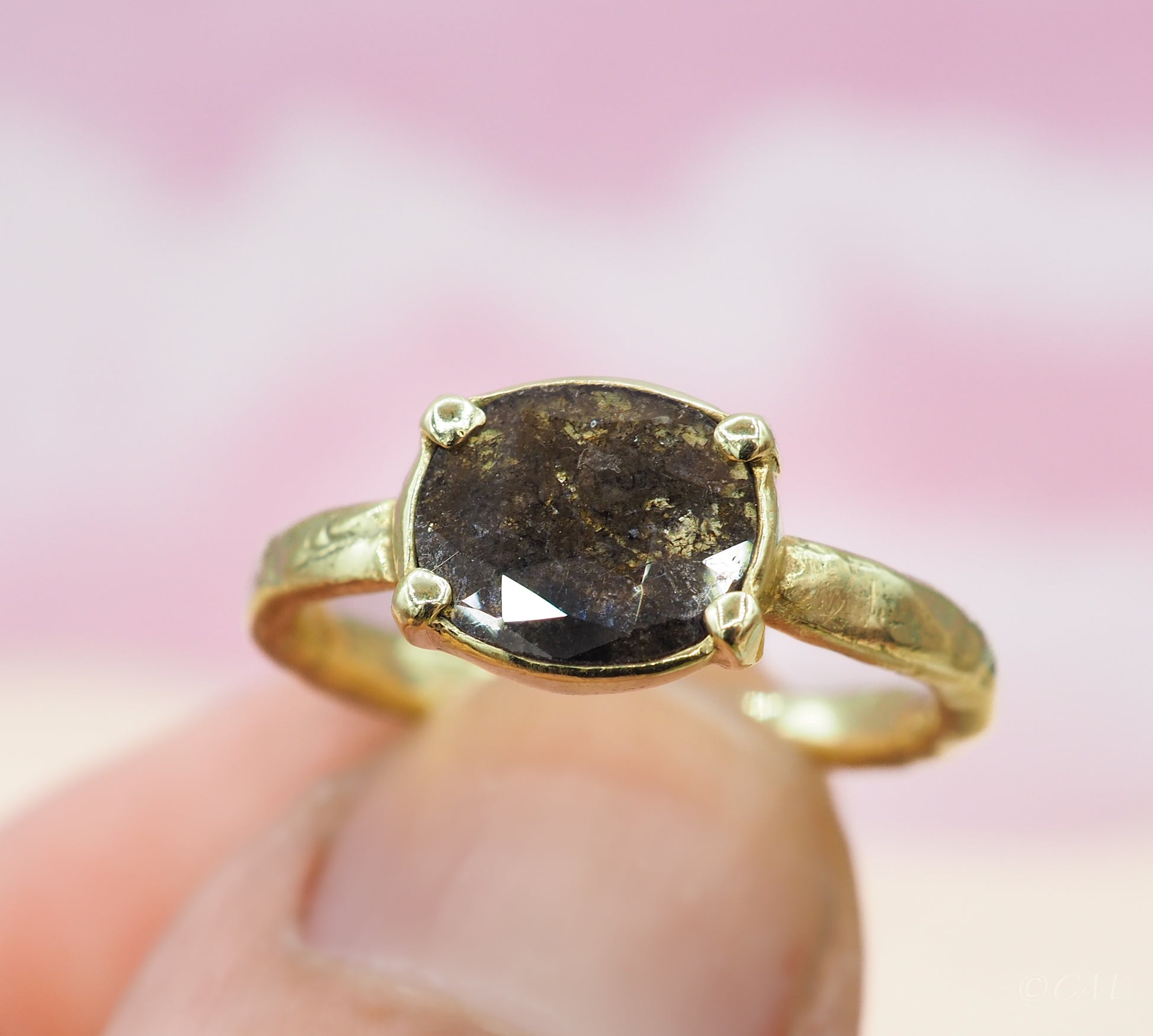 Een diamant met karakter. Deze betoverende ring is vervaardigd uit 14 karaat goud en draagt een schitterende salt and pepper diamant in roosslijpsel. De gemêleerde grijstinten geven de steen een mysterieuze diepte, terwijl de subtiele schittering zorgt voor een zachte, sprankelende gloed.