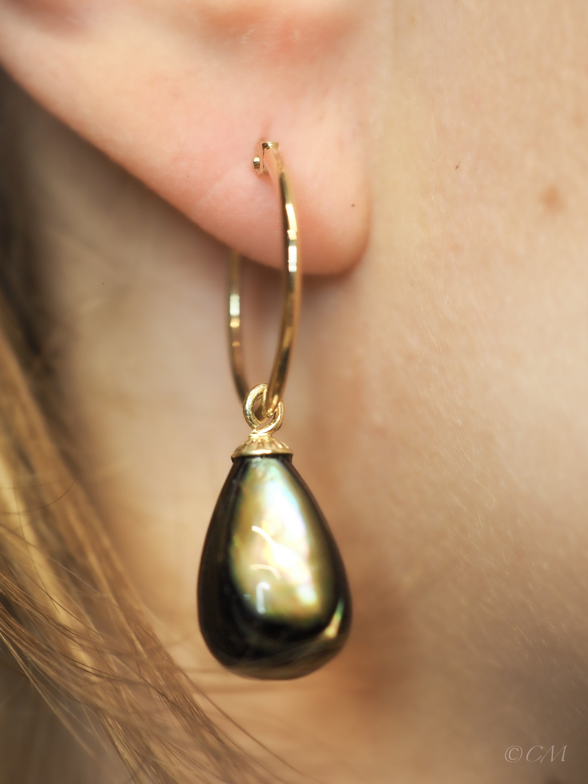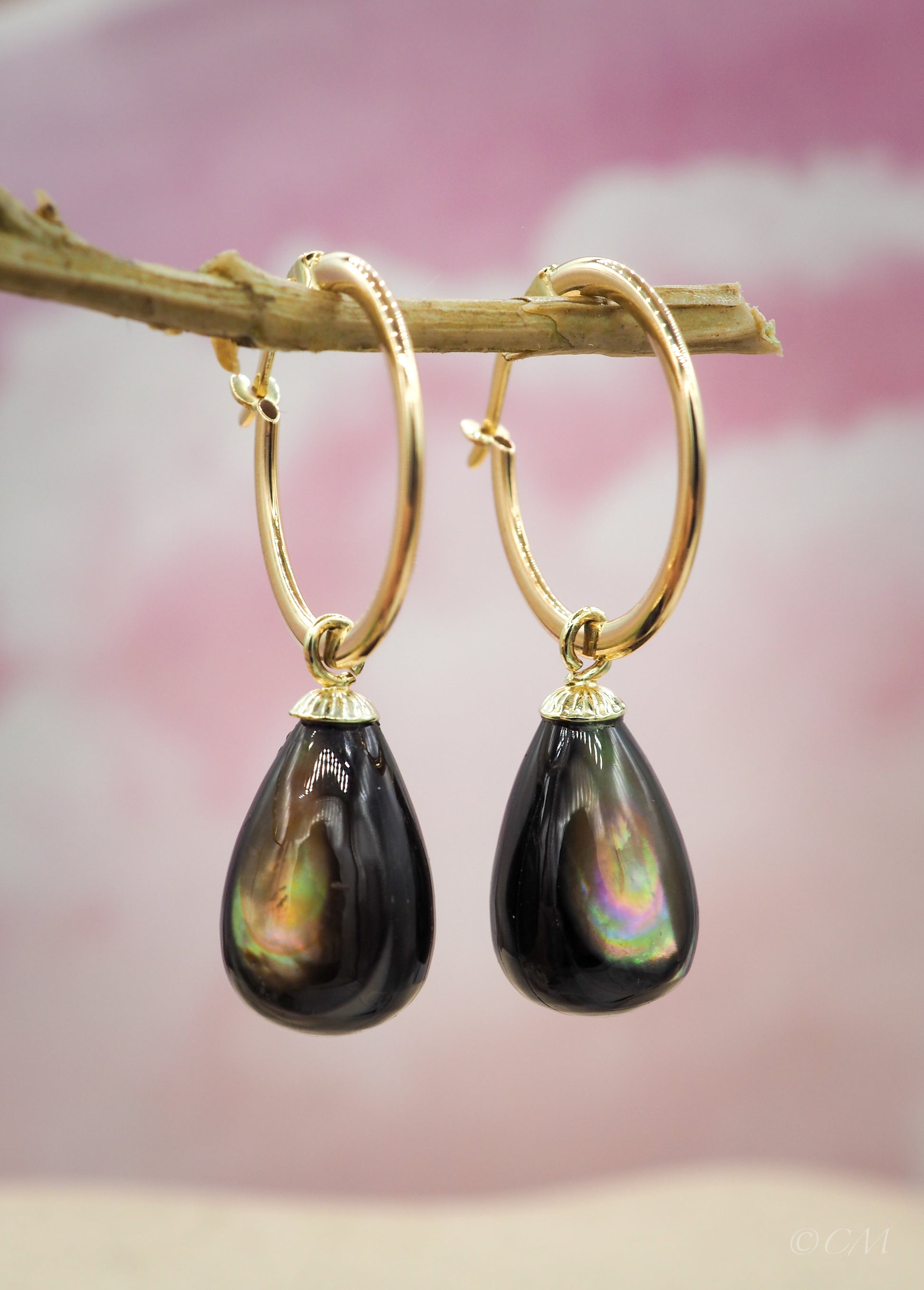 Deze verfijnde oorringen zijn vervaardigd van 14 karaat goud en voorzien van parelmoer hangers in mokkatint, subtiel gevormd in een elegante druppelvorm. De parelmoer heeft een zachte, glanzende gloed die bij elke beweging verandert — van diep mokka tot honingkleurig met een vleugje goud.