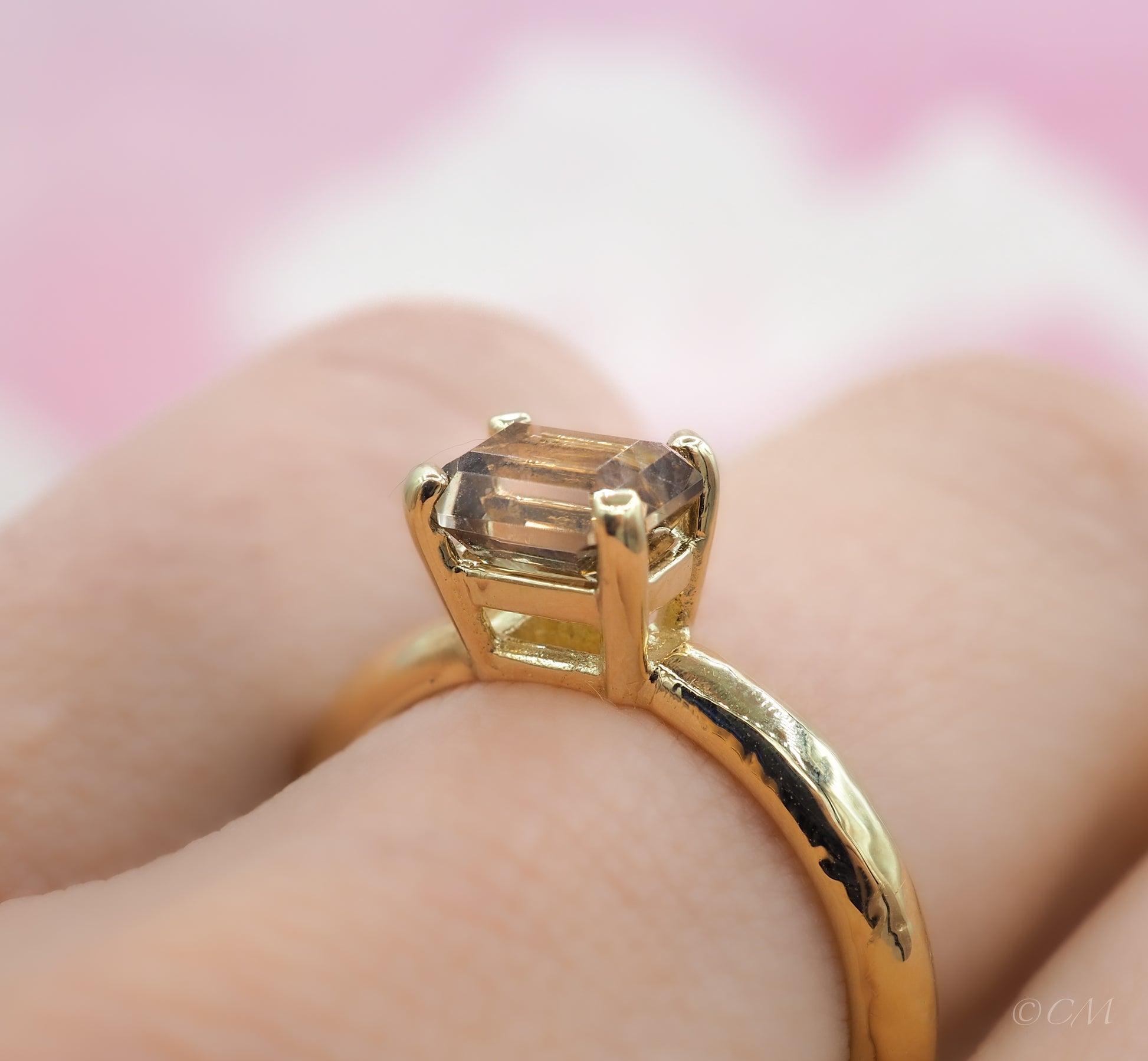 Deze unieke 14 karaat geelgouden statementring is voorzien van een volumineuze, facetgeslepen rookkwarts die royaal ruimte krijgt om boven de vinger te stralen.