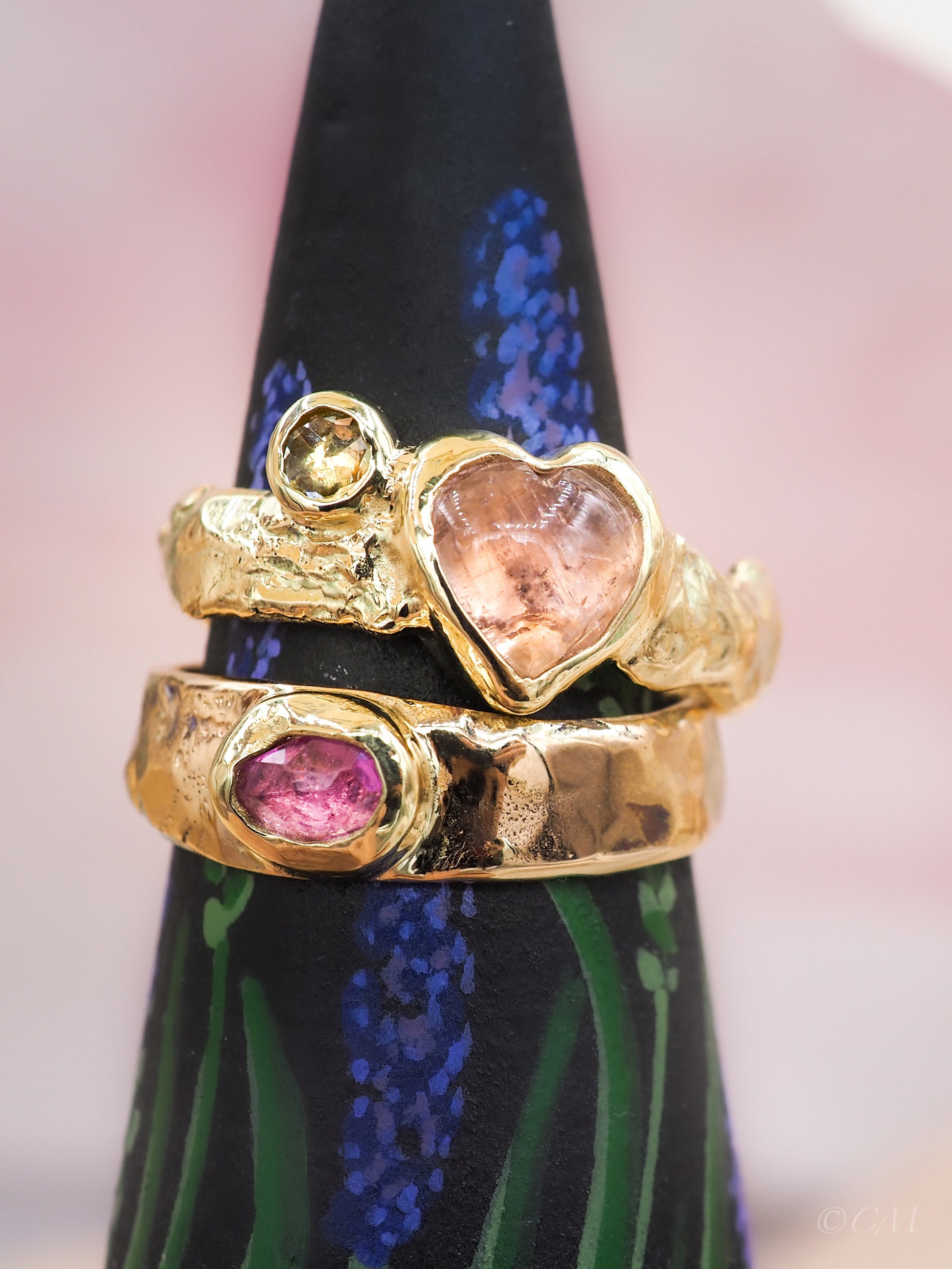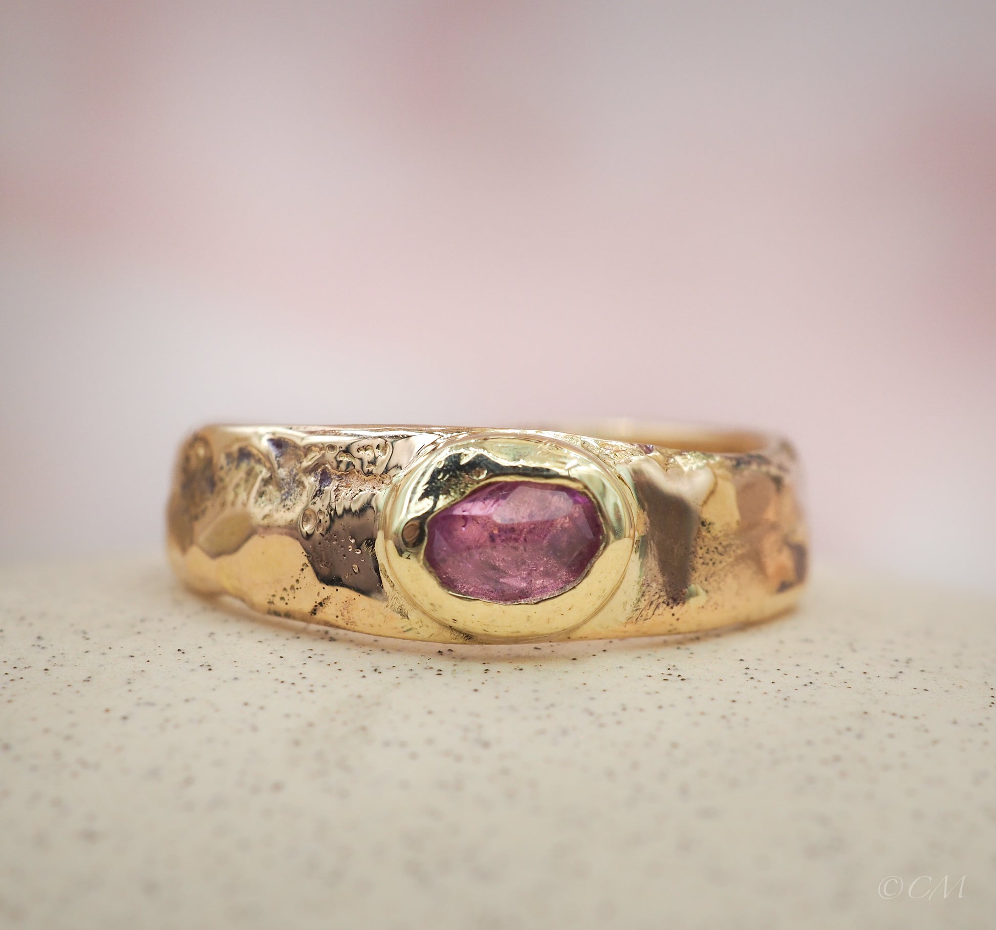 De combinatie van het warme goud en de roze tint van de saffier geeft de ring een uitgesproken maar verfijnde uitstraling. Elk detail is met de hand gevormd en gezet in het atelier van Camille-Maj in Zutphen, waardoor deze ring volledig uniek is.