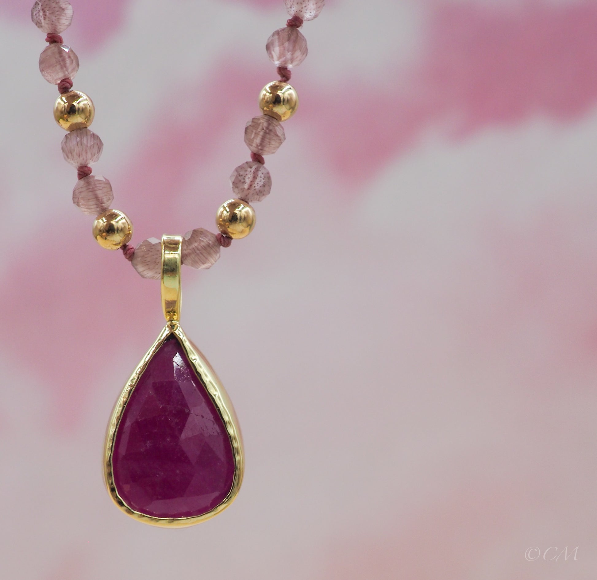Deze handgemaakte hanger is gezet met een grote, druppelvormige robijn, roosgeslepen voor een warme, levendige schittering. De steen is gevat in 14 karaat goud, waarbij de structuur van het zetten en de ponsslag subtiel zichtbaar is gebleven. Dat ambachtelijke detail geeft de hanger een extra gelaagd en uniek karakter – een sieraad waarin perfectie en handwerk samenkomen.