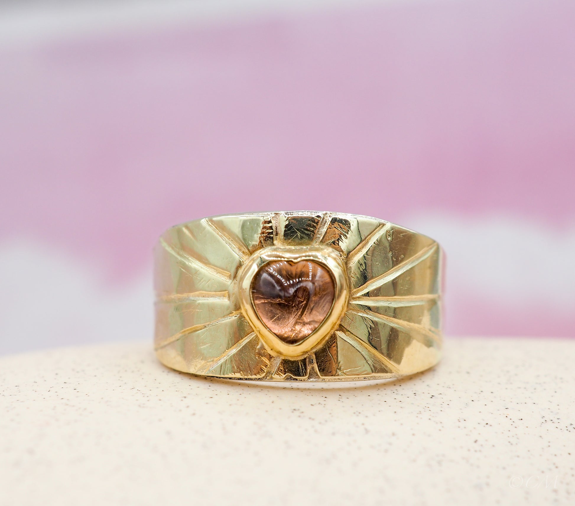 Echt een blikvanger — deze ring straalt pure zachtheid en kracht uit. In het middelpunt schittert een hartvormige roze toermalijn, liefdevol gezet in een omlijsting van 14 karaat goud. De steen vlamt in warme tinten en symboliseert liefde, compassie en balans.