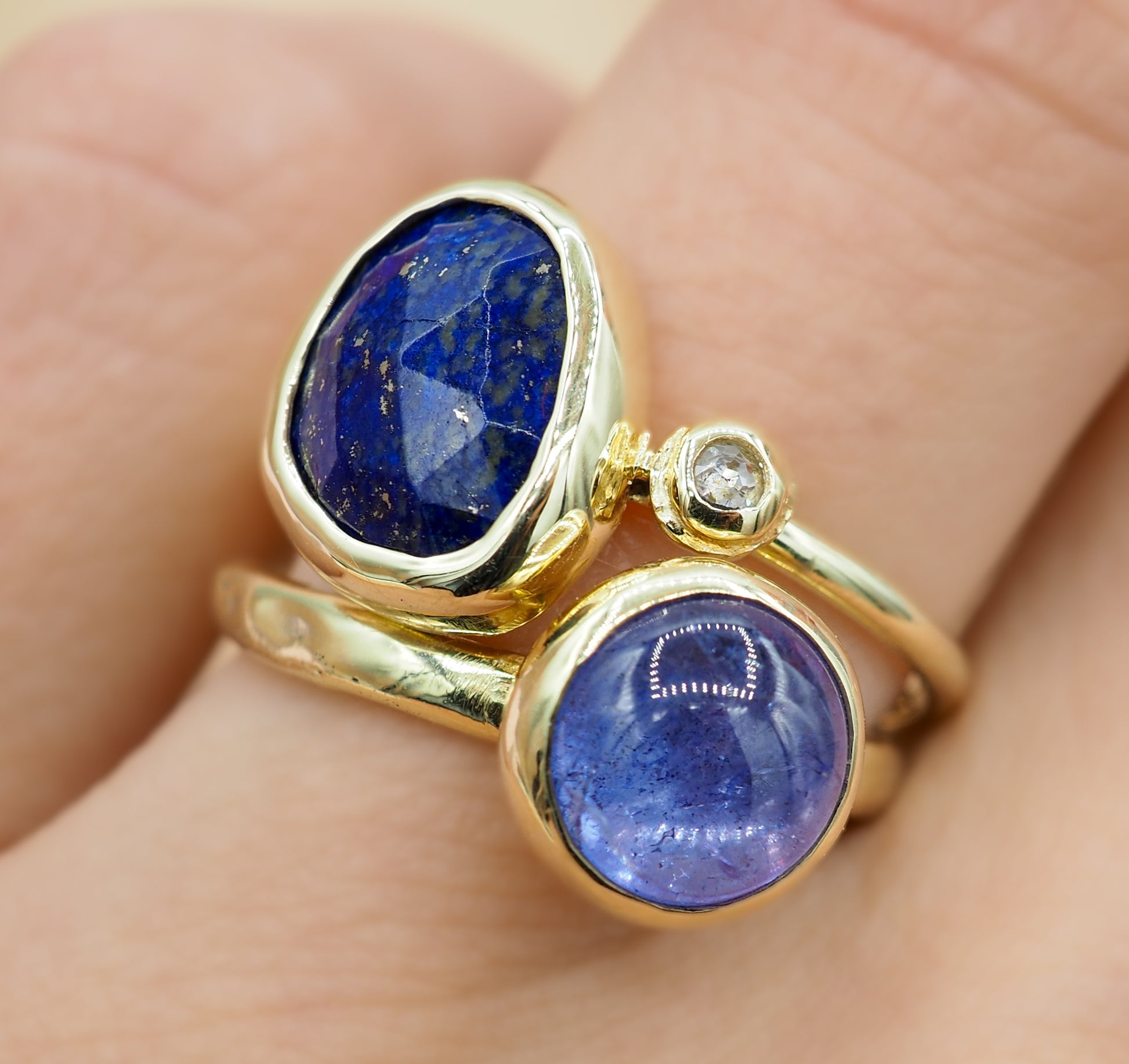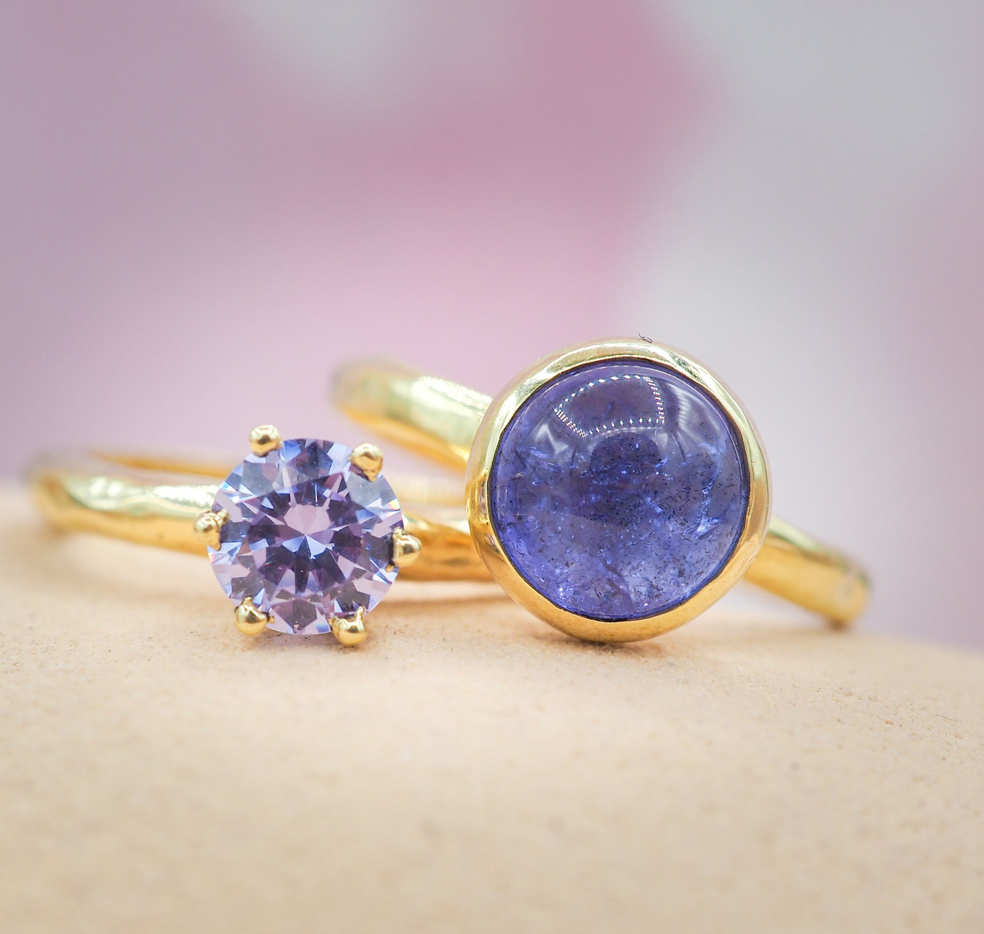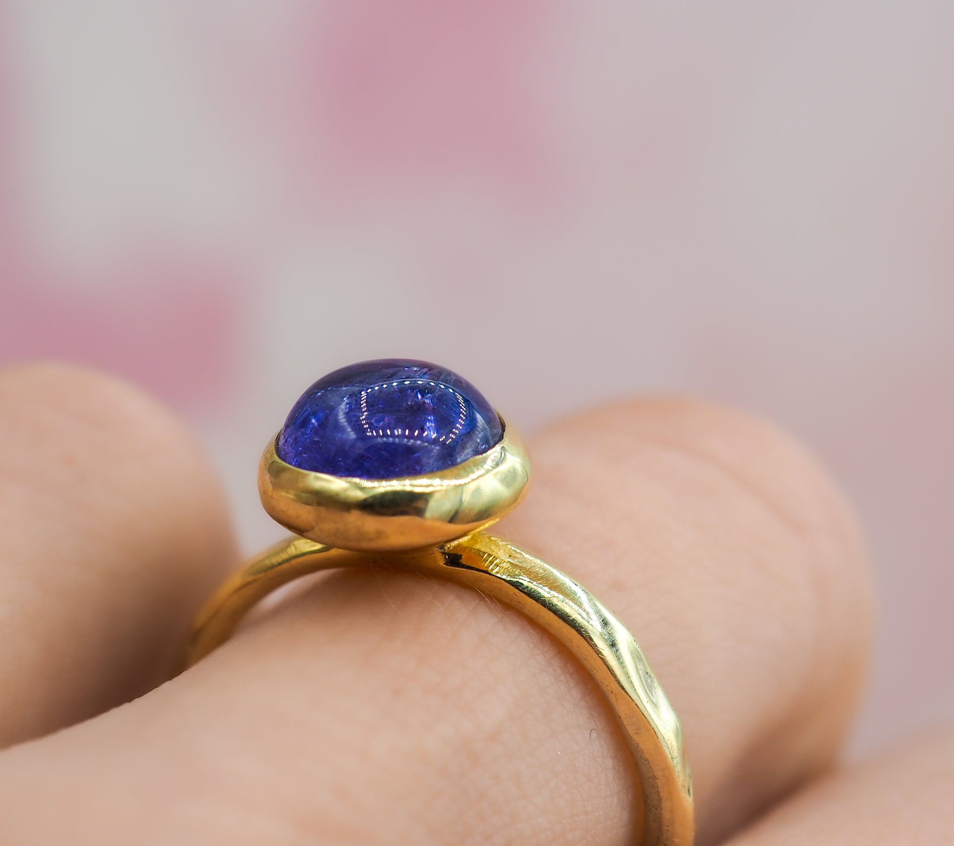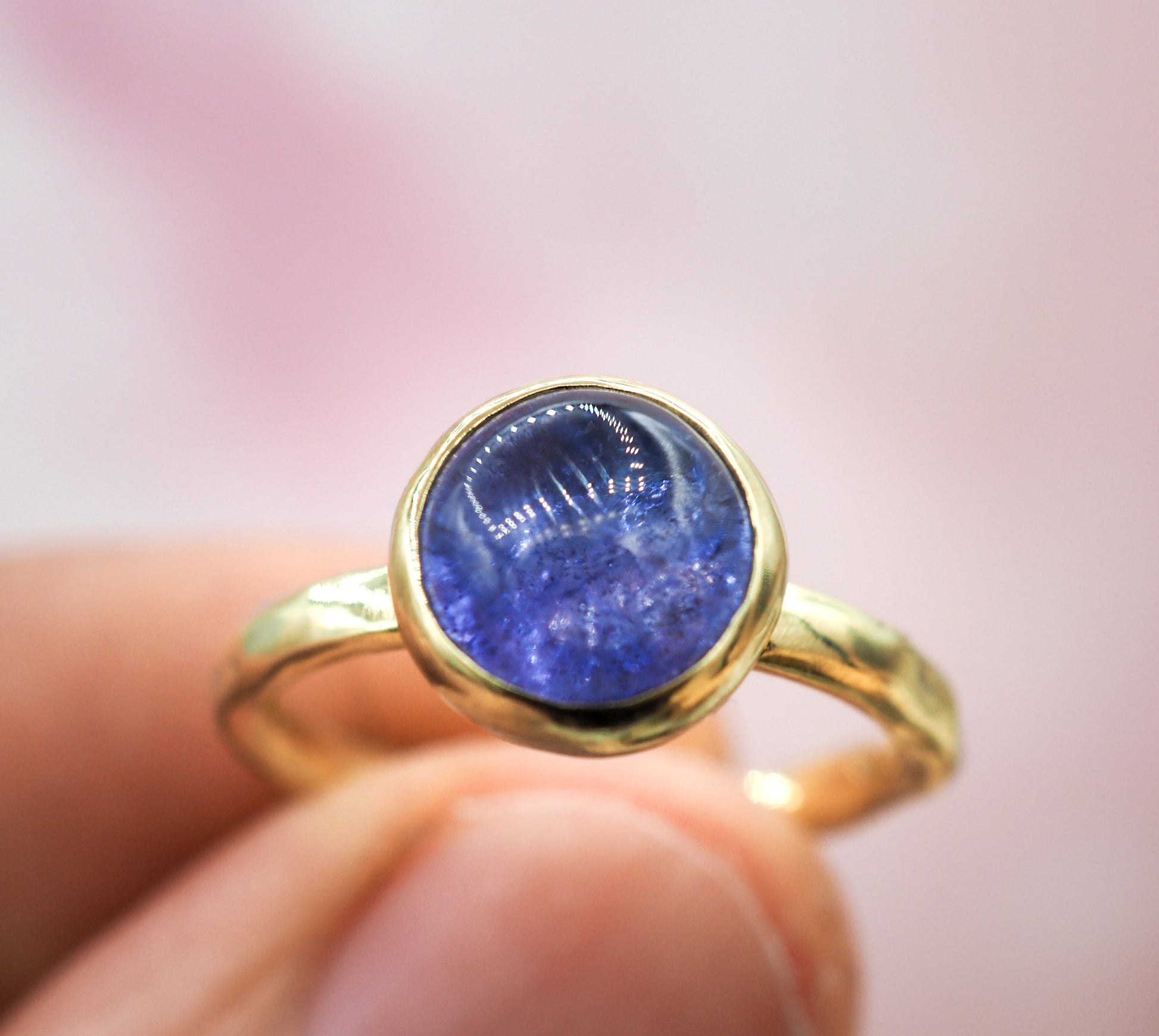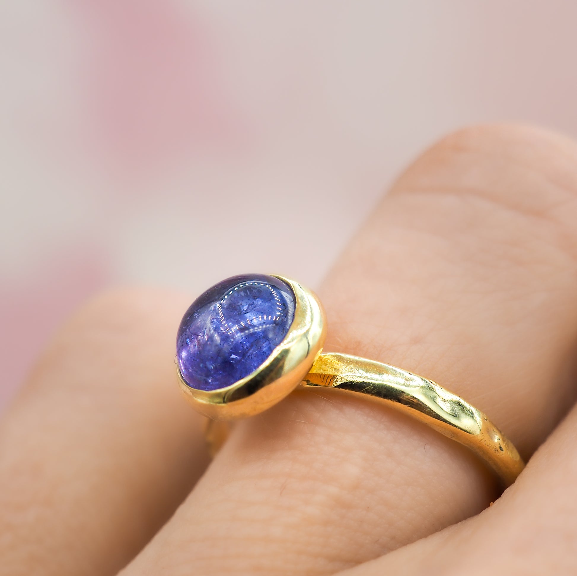 Een ring met een ziel. Deze betoverende, handgemaakte ring is vervaardigd uit 14 karaat goud en draagt een bijzondere tanzaniet — cabochon geslepen, waardoor de steen haar diepte en zachte glans volledig kan tonen. De kleur beweegt subtiel tussen blauw en paars, met natuurlijke insluitsels die de edelsteen een bijna magische uitstraling geven.