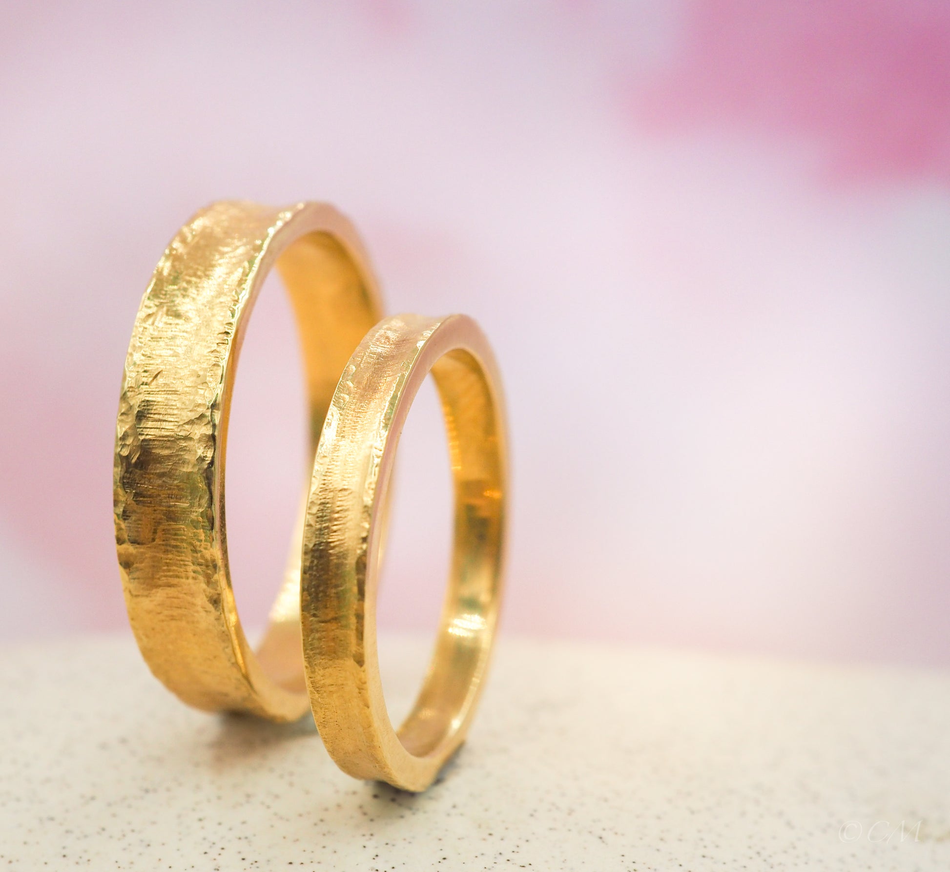 Deze handgemaakte trouwringenset wordt gekenmerkt door een unieke structuur en handmatige bewerking, waardoor de ringen hun eigen karakter krijgen. De subtiele textuur vangt het licht op een bijzondere manier en benadrukt het ambachtelijke vakwerk waarmee de ringen zijn gemaakt.